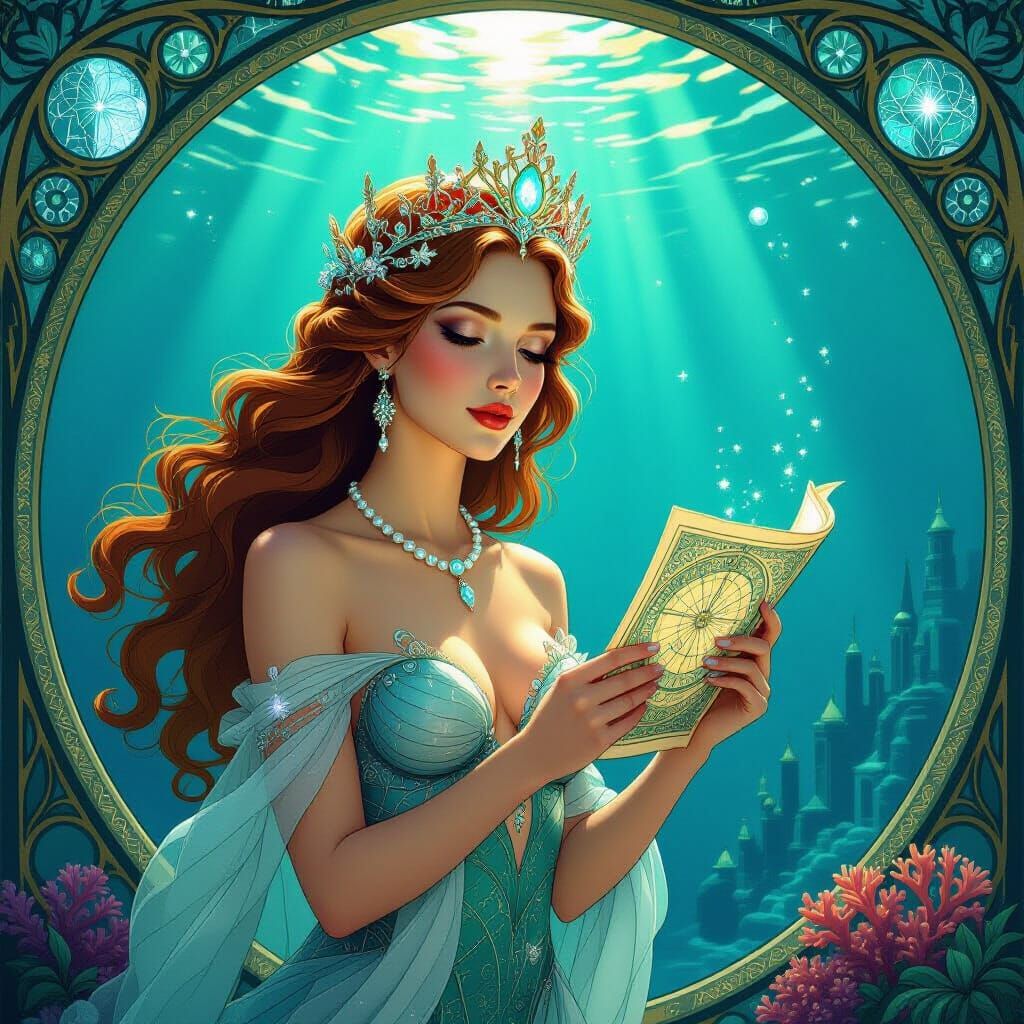 This image depicts a wise mermaid queen with a coral crown, overlooking a luminous Atlantean city. Rendered in the opulent Art Nouveau style, the scene glows with deep-sea light and intricate details.