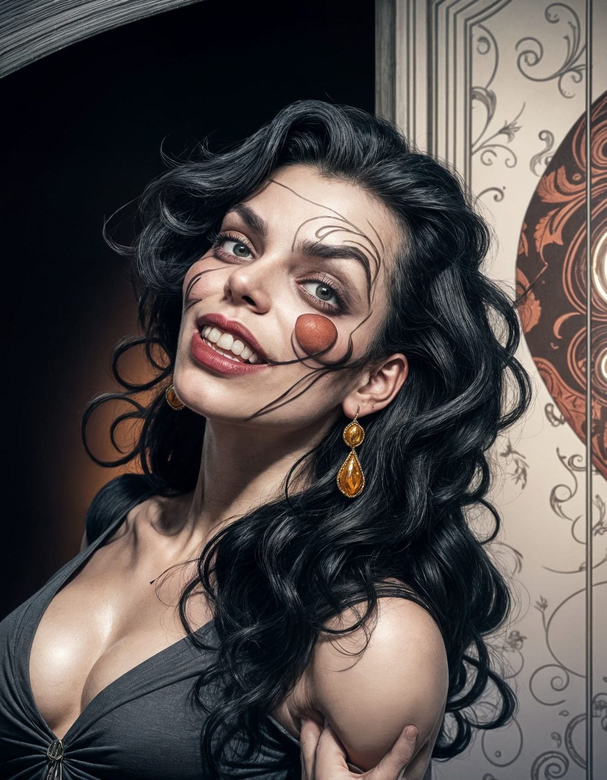 This image is a digital illustration of a goddess in a dark, surreal setting, featuring volumetric lighting and a maximalist aesthetic with sharp focus and vibrant colors.