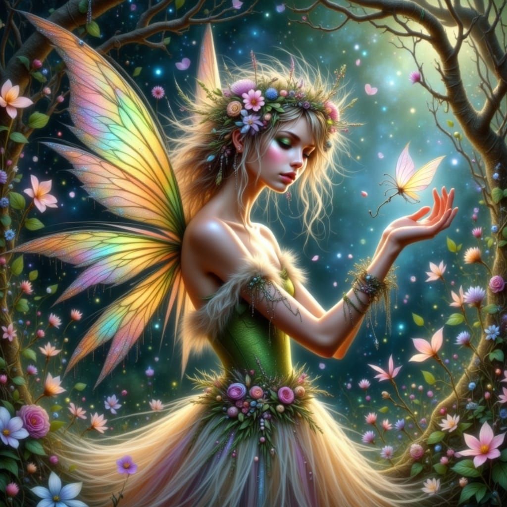 This image depicts a genderless wisp, a Wunschfee, with iridescent wings, floating in a moonlit field of flowers. Rendered in a luminous watercolor style with soft focus.