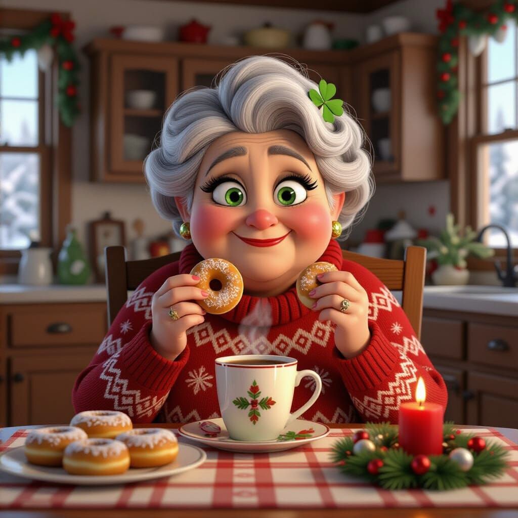 This image shows a funny, chubby grandma with green eyes and grey hair, wearing an ugly Christmas sweater, enjoying coffee and doughnuts in a decorated kitchen. Rendered in 3D digital art style.