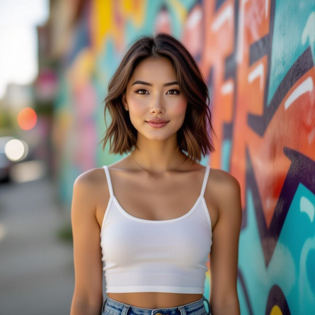 Generate stunning images of beautiful Asian women with short brown hair and colorful backgrounds. Free and easy to use!
