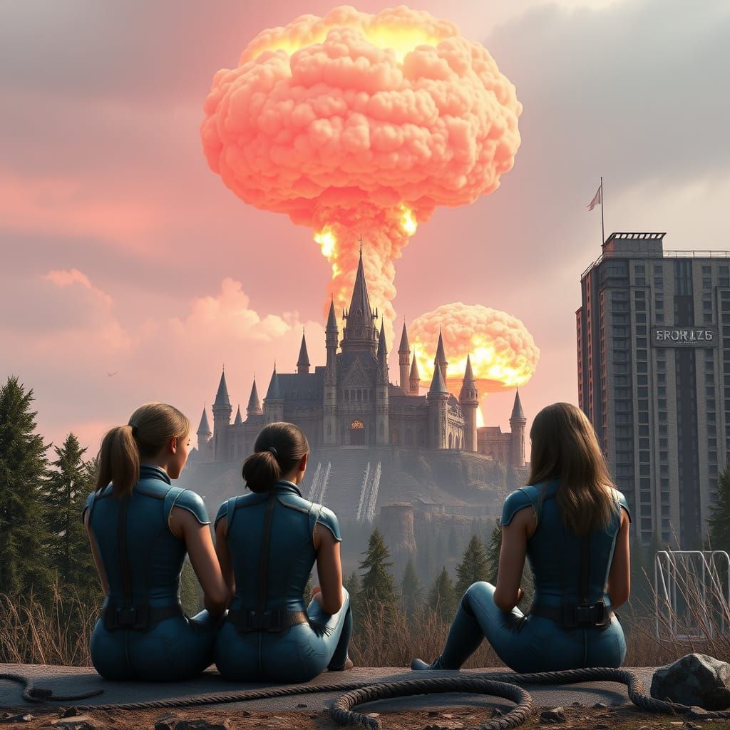 This image depicts two female vault dwellers in radiation-resistant unitards observing the devastating explosion of a massive castle from a safe distance. The scene is rendered in 8K resolution with intricate details and dynamic lighting, capturing the epic moment of nuclear destruction in a 3D game cine...