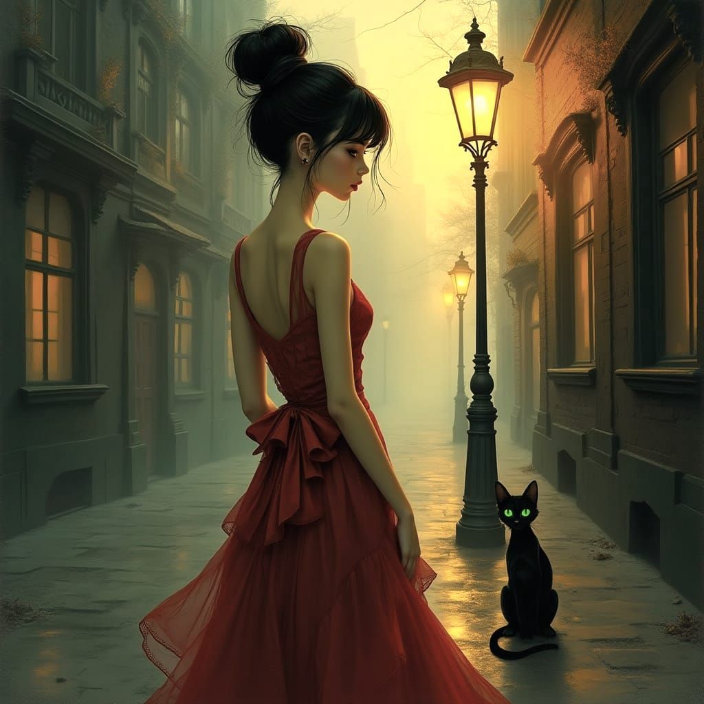 A digital illustration of a silhouetted woman with a cat under a streetlamp. The backdrop features Victorian buildings in golden sunlight and teal shadows. The artwork is gothic and whimsical.