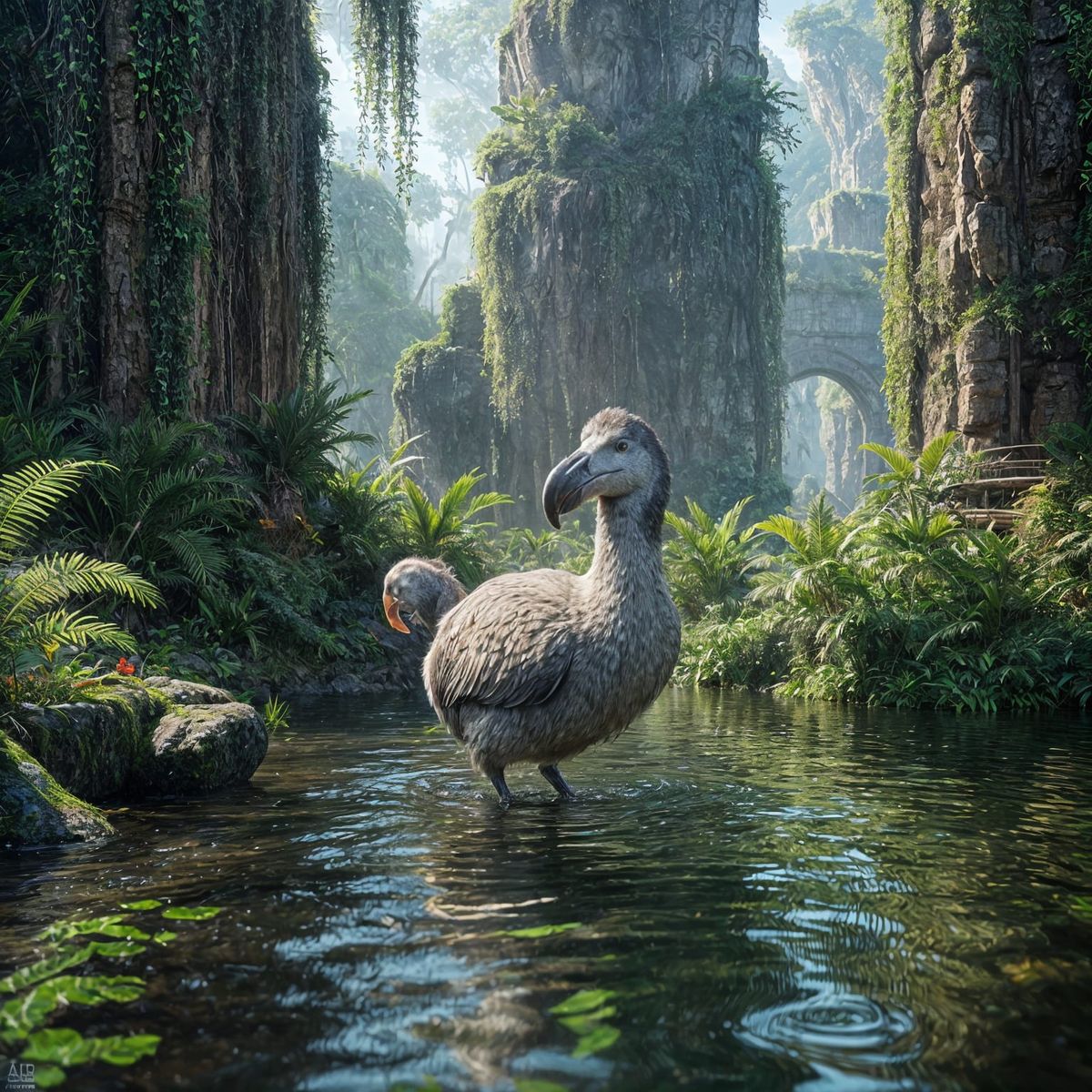 This image shows a dodo bird wandering through overgrown ruins, with sunlight filtering through the water. It's rendered with vivid colors and intricate details, in a playful, nostalgic digital art style.