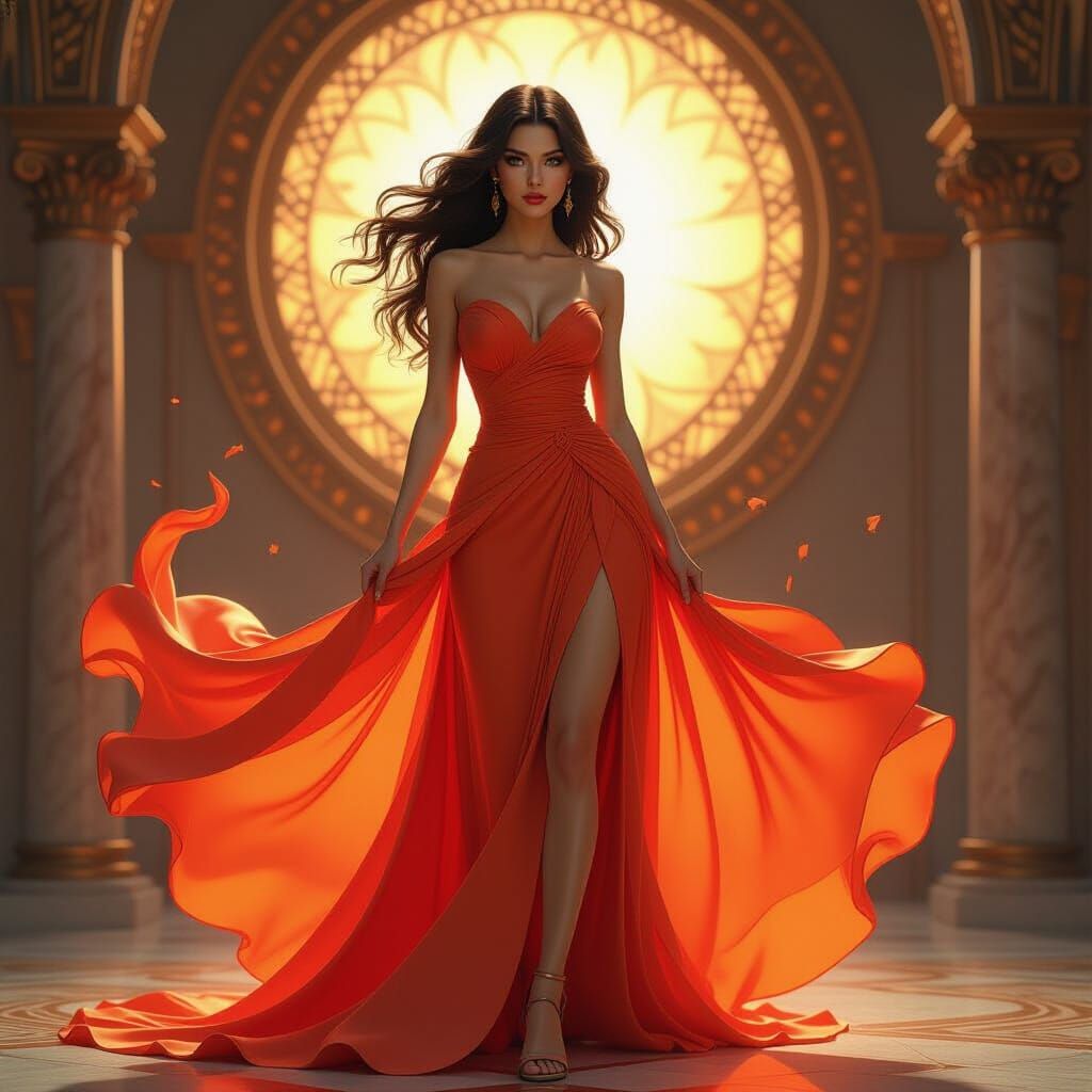 A hyper-realistic portrait of a woman in a dress of vibrant flames. The image showcases dynamic lighting and triadic colors, reminiscent of art nouveau with volumetric lighting effects.