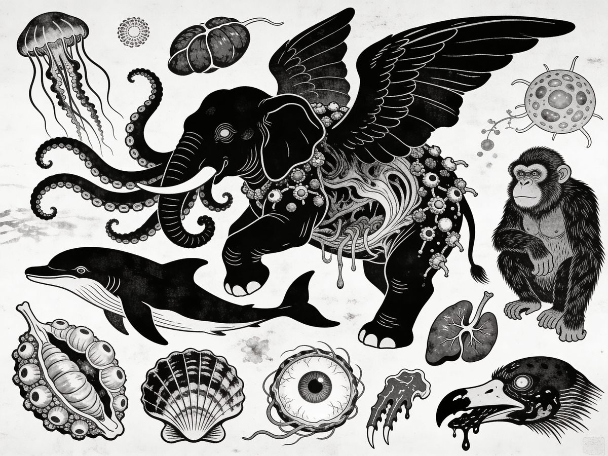 A bizarre, monochrome ukiyo-e style image depicting a horrific mutant creature with elements of an elephant, calamari, dolphin, and ape, rendered in a grotesque, unsettling manner.
