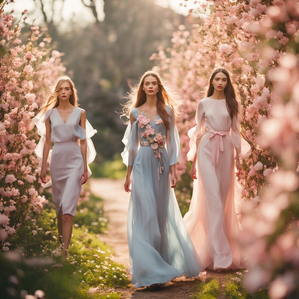 This image shows models on a catwalk surrounded by honeysuckle. The dresses feature delicate petals and soft, pastel colors, captured in a vibrant and elegant high-fashion style.