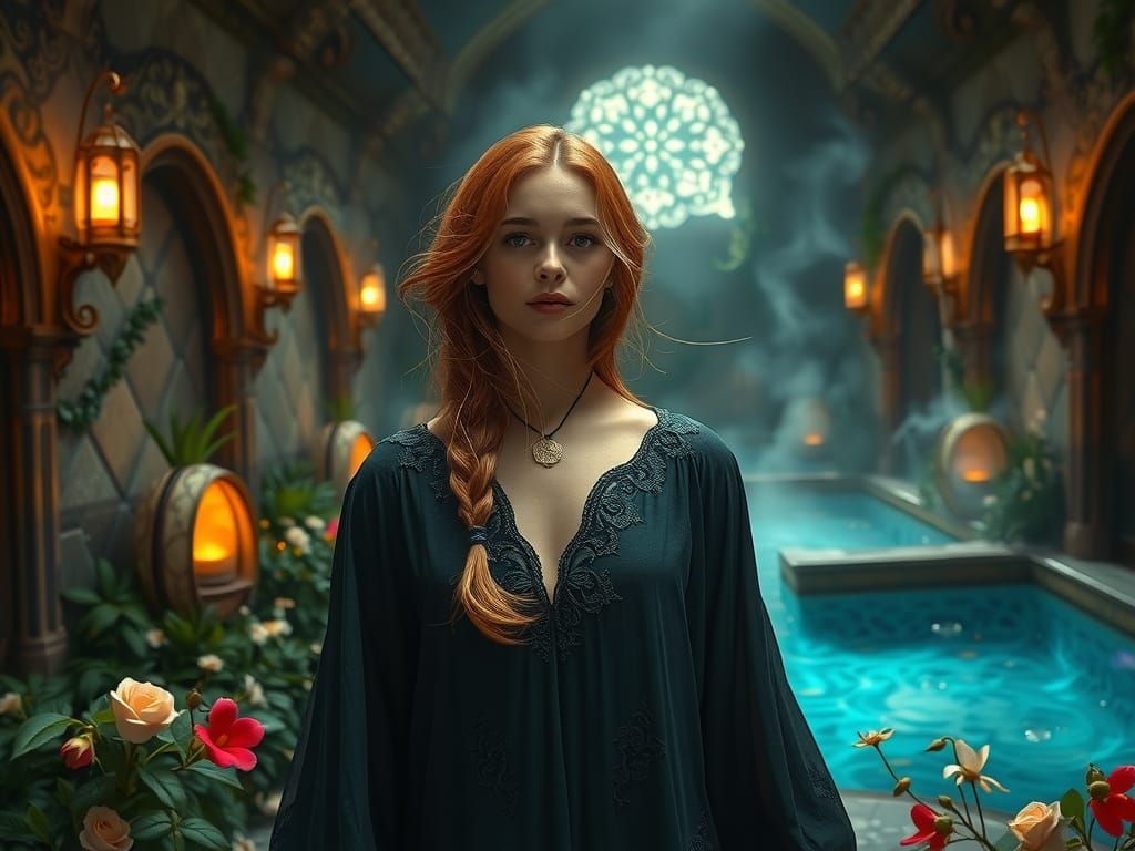 This enchanting image shows a young woman with auburn hair and a flowing plait walking through a mystical medieval spa, surrounded by ornate gold details, soft lanterns, and lush greenery, evoking a sense of fantasy and wonder in a photorealistic, cinematic style.