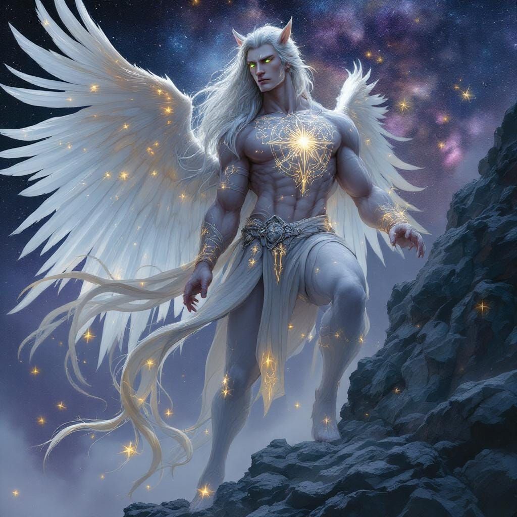 A striking picture of a muscular centaur standing on a misty cliff under a starlit sky. The centaur has the torso of an elven warrior, a white horse lower body, and large feathered wings in a dark fantasy aesthetic.