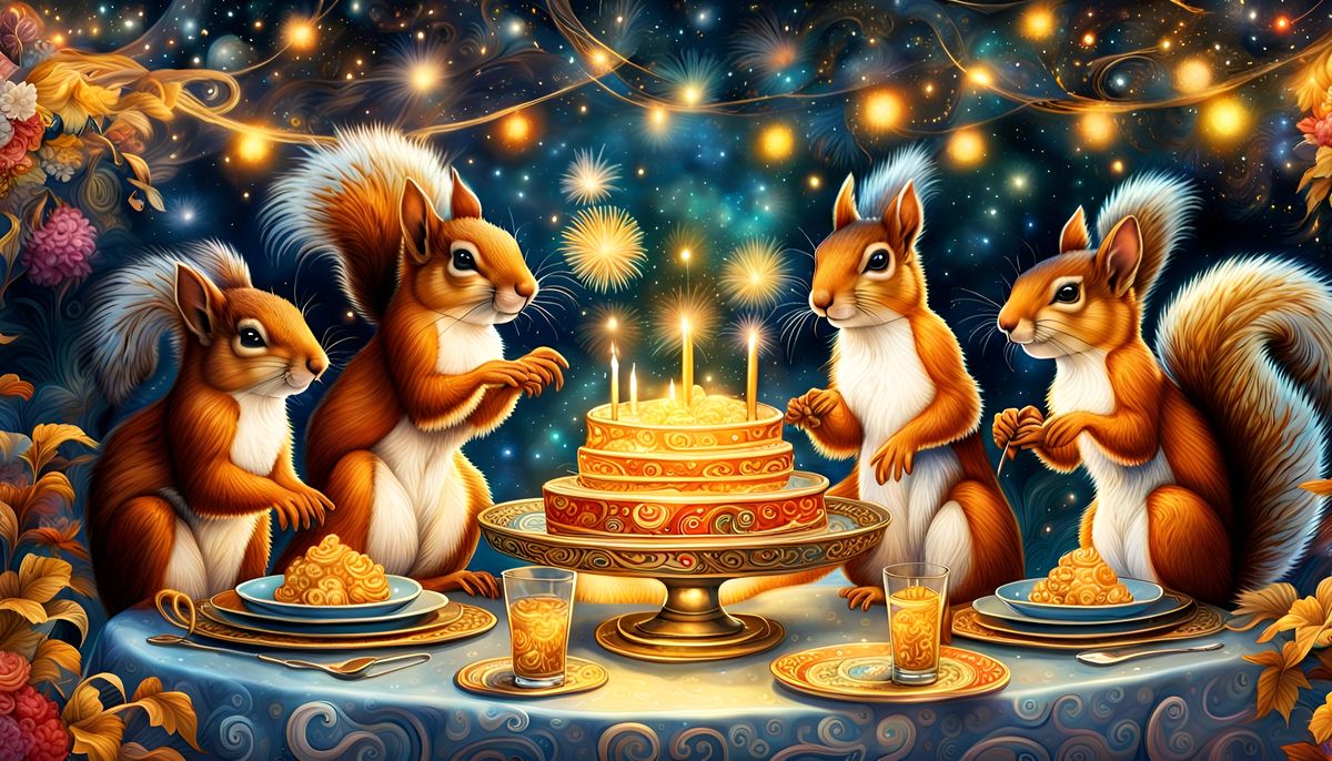 This image shows squirrels celebrating New Year's Eve around an ornate table. The background features colorful psychedelic swirls, fireworks, and stars, rendered as a delicate watercolor fantasy illustration.