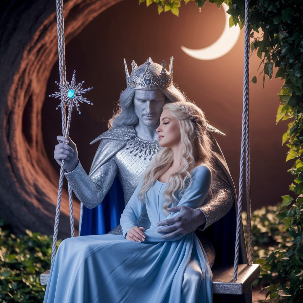 A captivating image features a silver king with flowing hair and a crown, embracing a blonde woman in a moonlit garden. Soft light accentuates the ethereal scene.