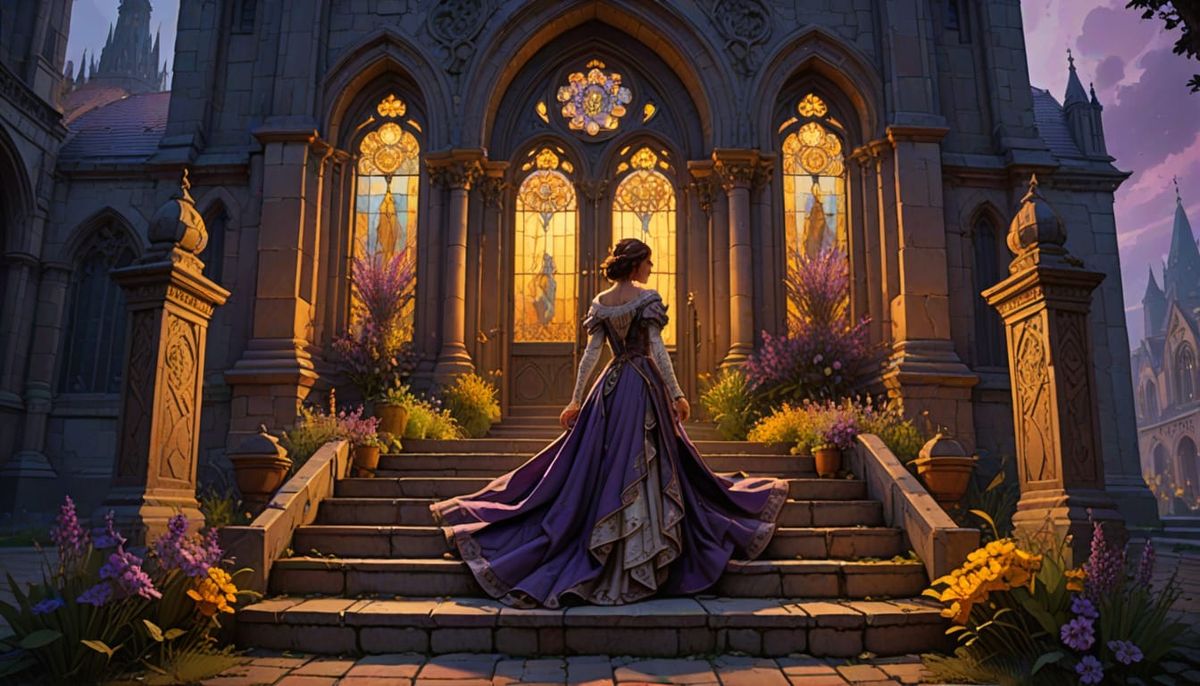 This image shows a boy and girl dressed as a groom and bride in oversized vintage clothing, standing on church steps. The whimsical concept art features vibrant colors, delicate lace, and floral patterns in an Art Nouveau style.