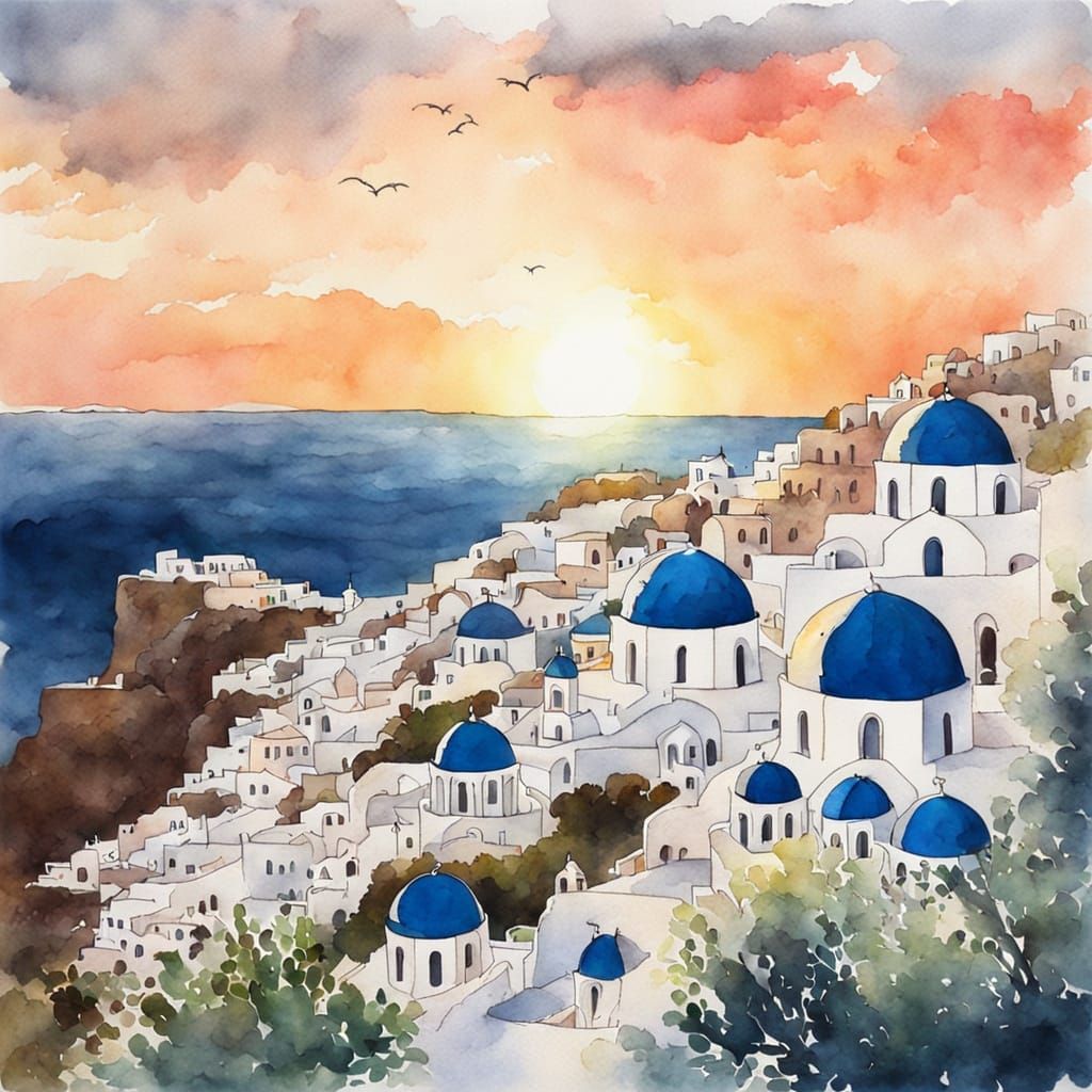 Create your own watercolor paintings of Santorini sunrises with our free AI image generator.