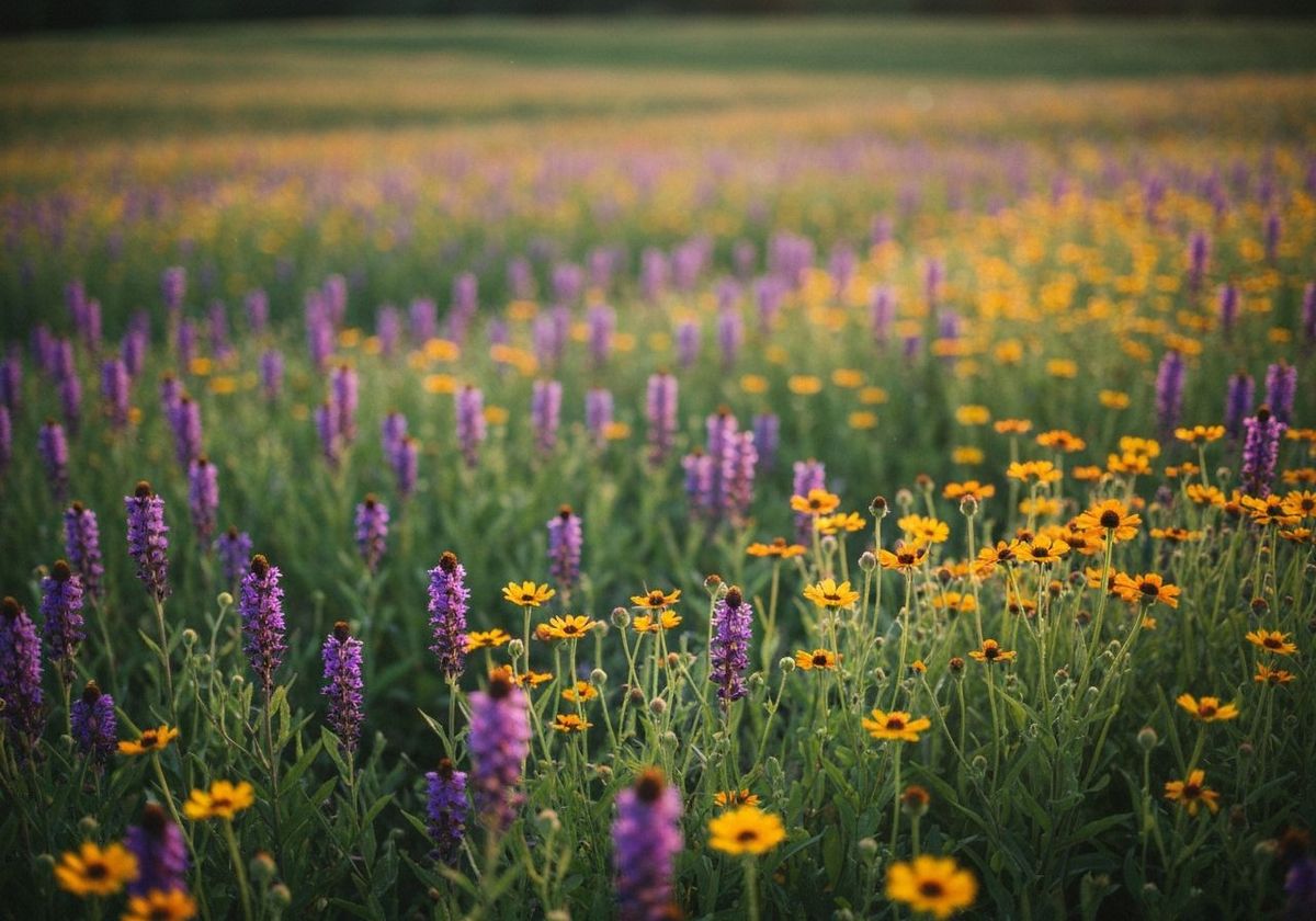 This image shows a sunlit field of wildflowers in full bloom, captured with a shallow depth of field and blurred background. The scene evokes a vintage aesthetic with muted tones.