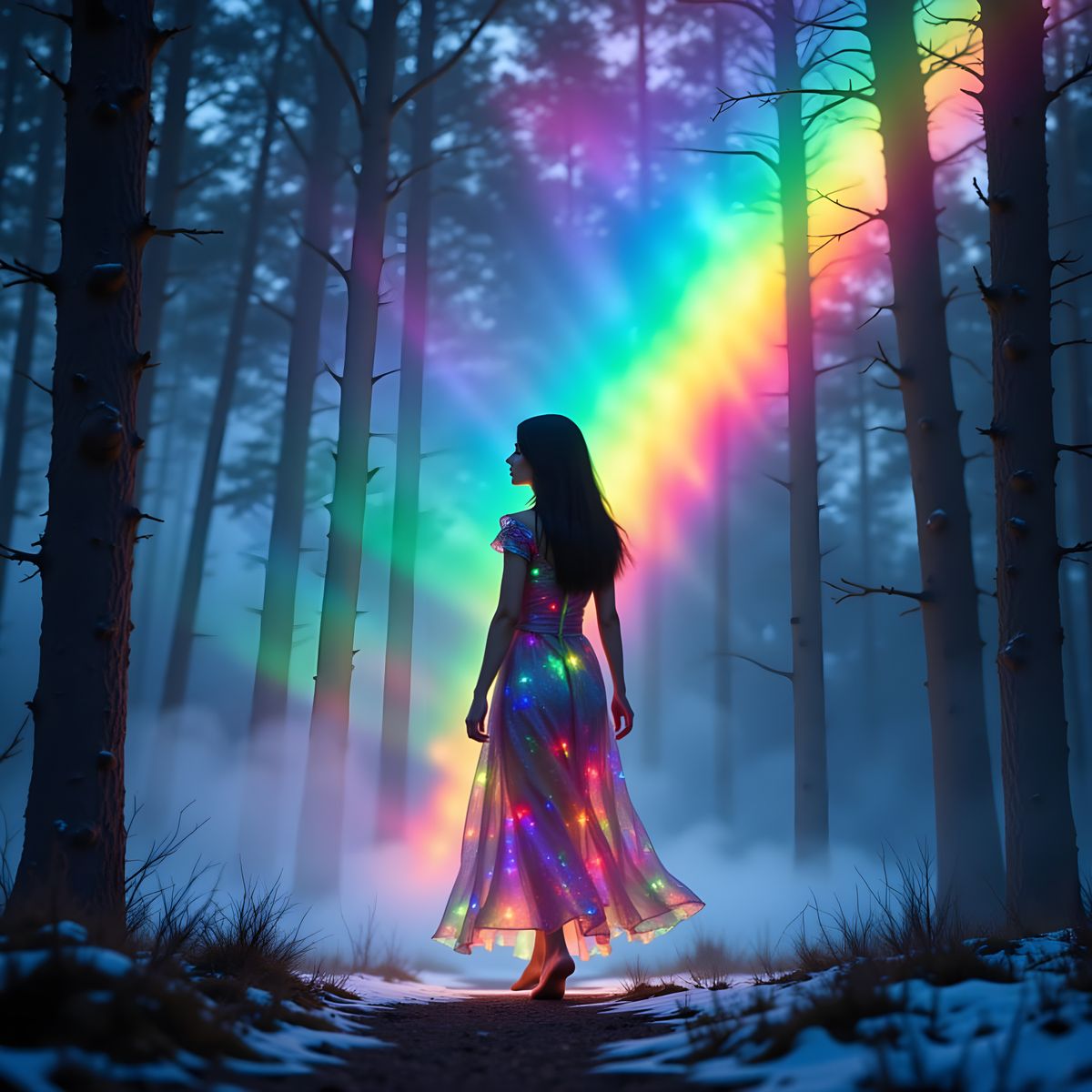 A photorealistic portrait of a maiden in a colorful dress walking on a vibrant rainbow. Features moonbeams, aurora borealis, and volumetric fog in a forest setting, with luminous, painterly textures.