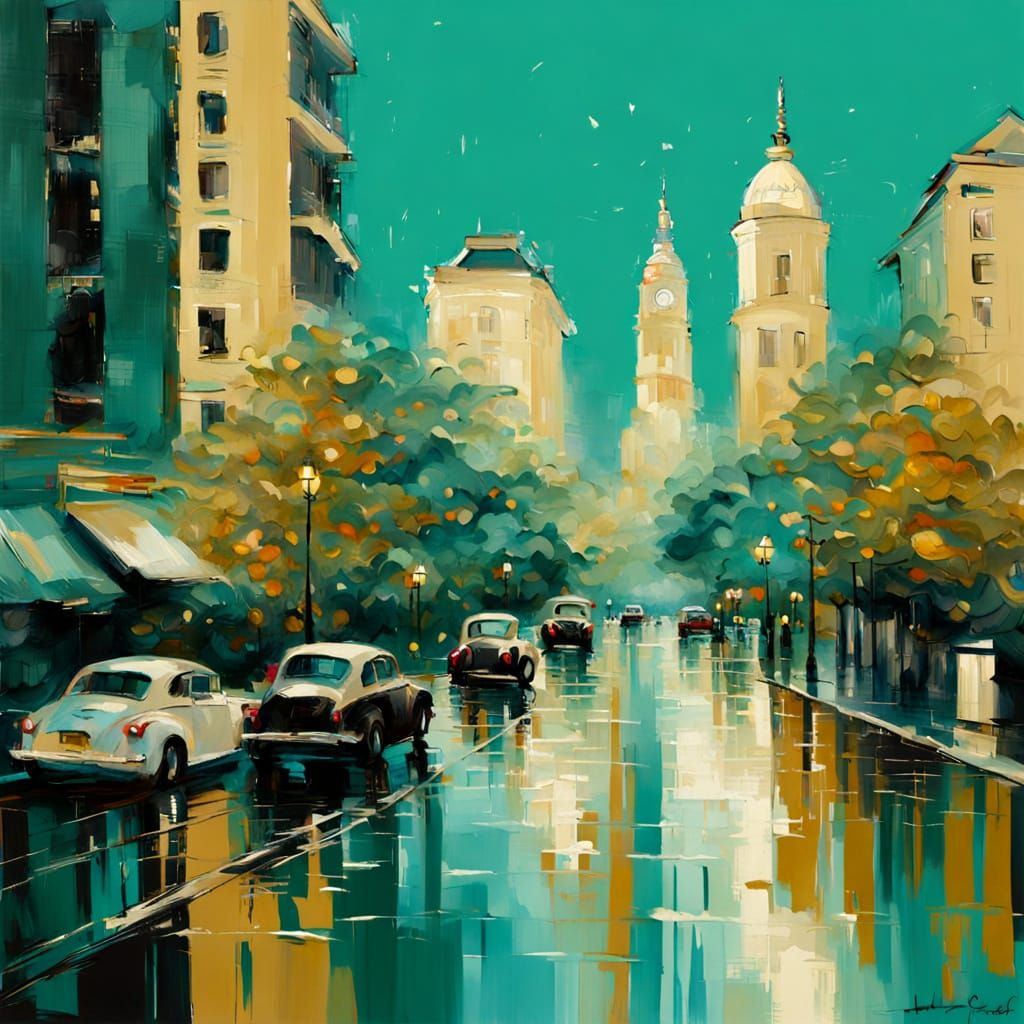 This image depicts a city morning scene rendered in an impressionistic style. The artwork features a teal and beige color palette, creating a serene and calming urban landscape.