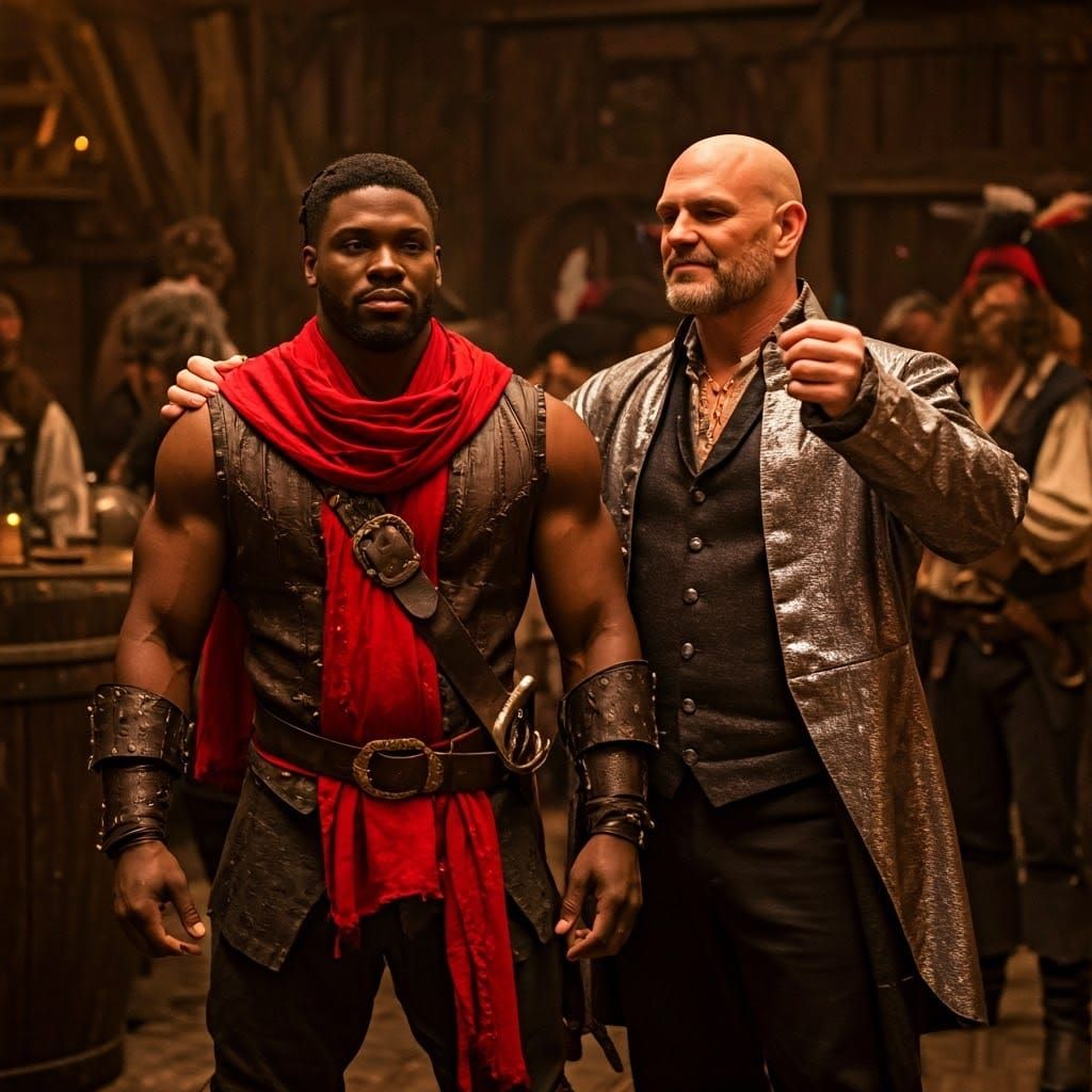 This image shows a group of pirates celebrating in a medieval tavern. A young black pirate stands proudly, draped in a Scarlet scarf, while an older pirate and a European pirate stand beside him, all dressed in ornate attire.