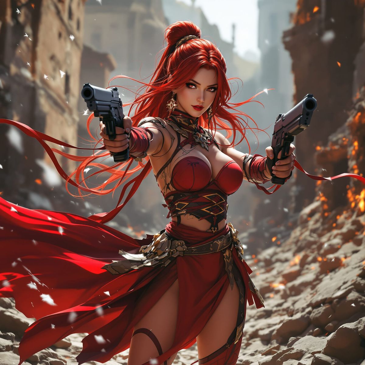 This dynamic concept art portrait features a warrior woman in a red outfit and red hair, guns drawn amidst ruins. It showcases hyperdetailed, intricate elements with volumetric lighting.