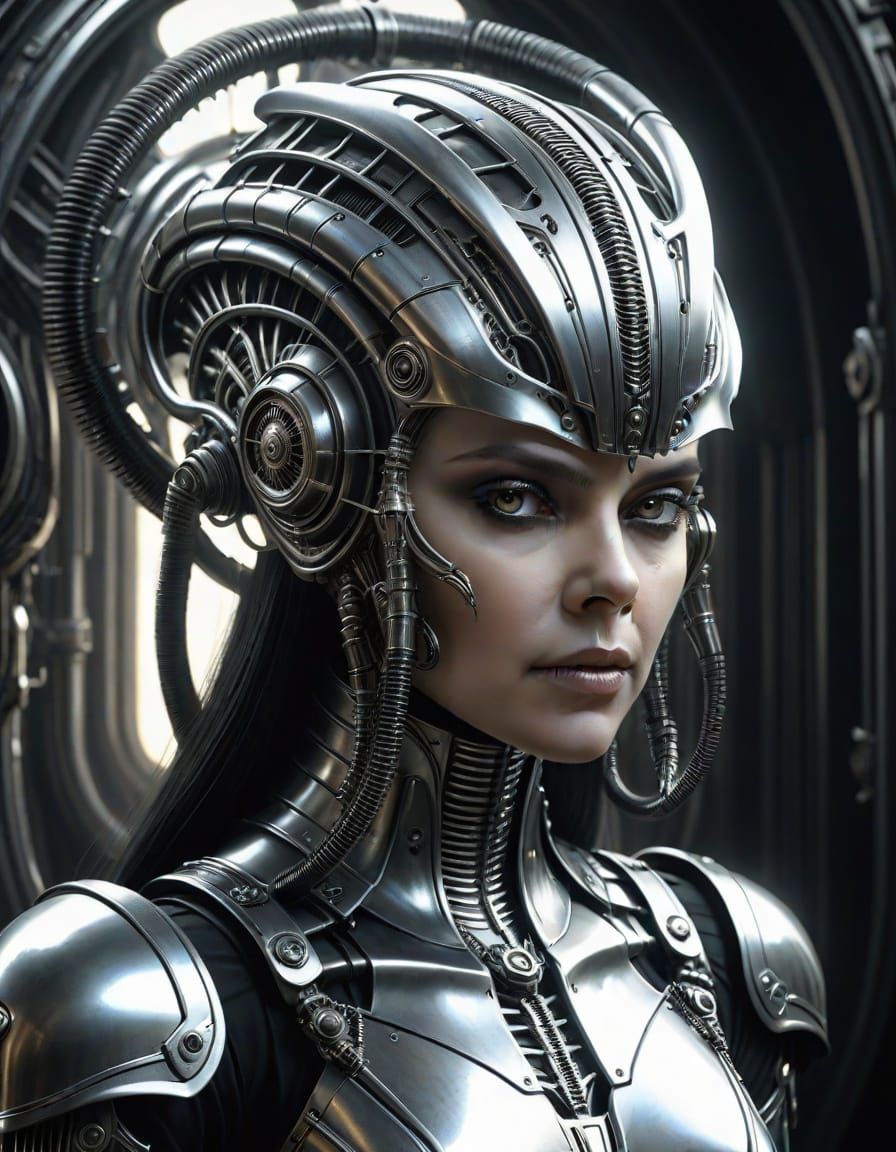 A striking portrait of a shiny silver biomechanical steampunk android, rendered in dark, volumetric lighting with sun rays, evoking a sinister, Giger-esque aesthetic.