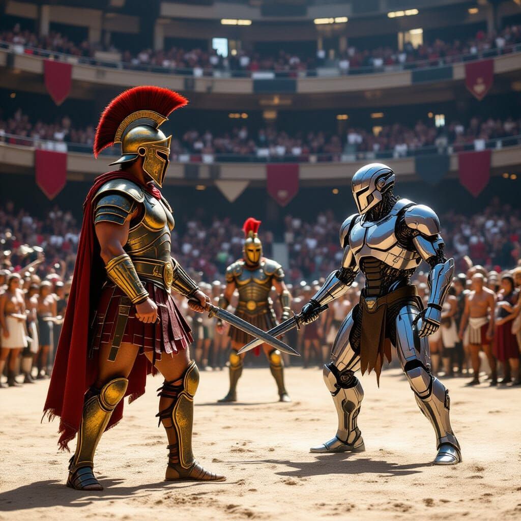 This image shows ancient Roman gladiators battling cyborg warriors in a futuristic arena filled with a diverse crowd. The scene is photorealistic, blending historical armor with sleek, metallic designs to capture a brutal and intense fusion of past and future.