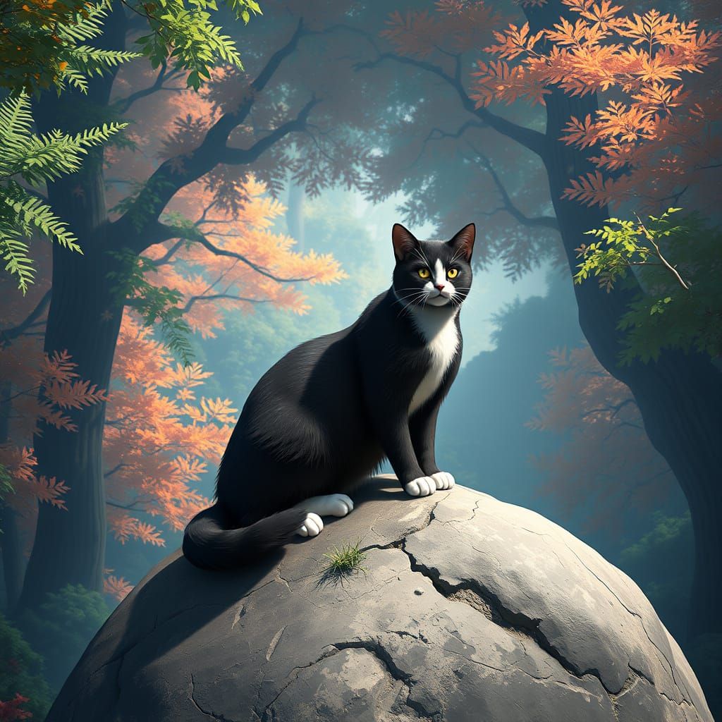 This image shows a black cat with white markings sitting peacefully on a boulder in a lush forest. It's 3D anime art with ultra-fine textures, resembling Genshin Impact concept art.