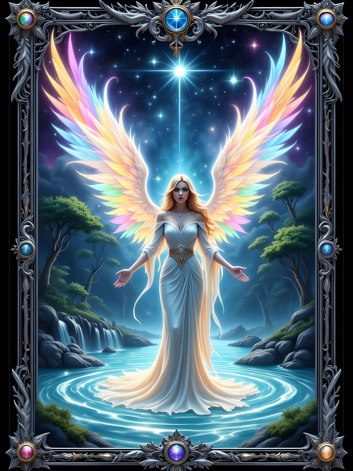 A radiant angel with majestic, holographic rainbow wings depicted in a mystical tarot card style. Features a paradise setting with glowing trees and cosmic background.