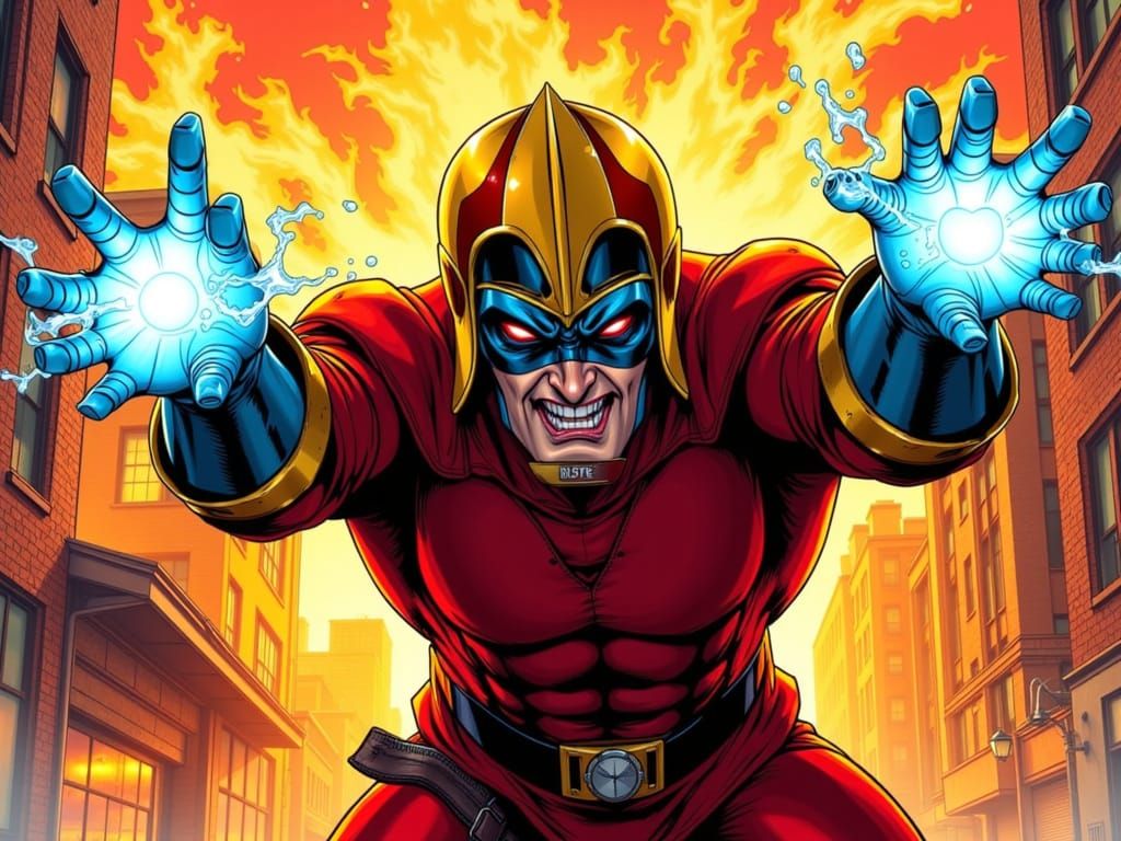 A dynamic image shows a male superhero, clad in firefighter gear, using water blasts to extinguish a city fire. Rendered in a vibrant graphic novel style.