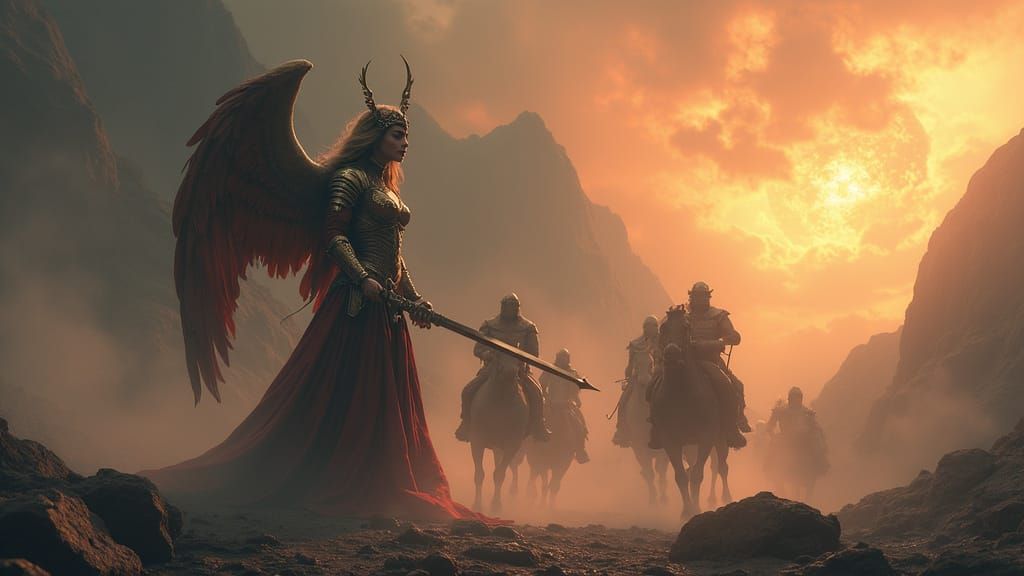 A digital matte painting of Archangel Angela in armor, sword in hand. Behind her, the Four Horsemen of the Apocalypse ride through a dramatic landscape with fog, mountains, and fiery sky in a dystopian style.