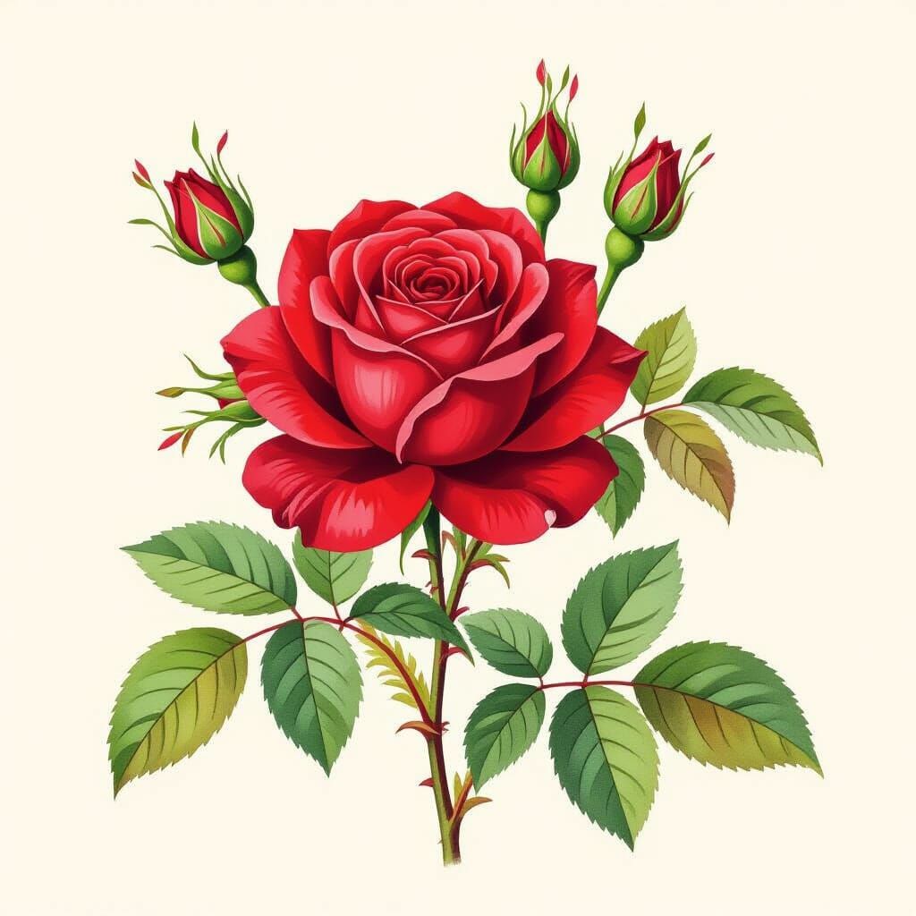 Red rose engraving, colored with watercolors, herbal book illustration in Pierre-Joseph RedoutΓ© style