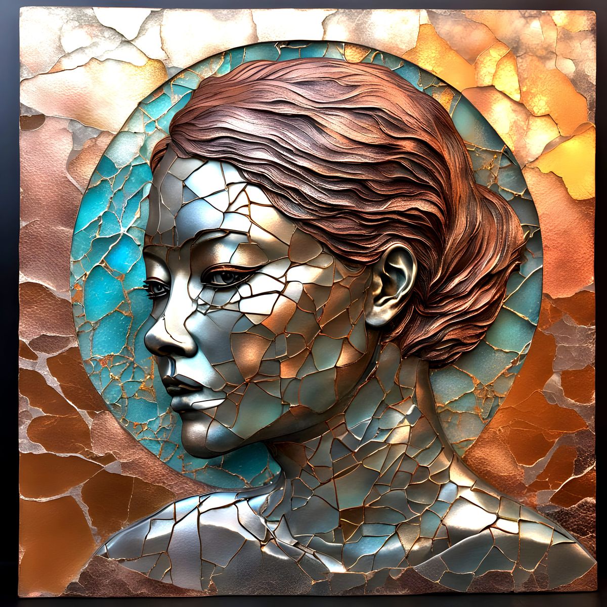 This image shows a stunning, abstract female figure in a rich, metallic patina with opalescent stone textures and vibrant colors, featuring kintsugi elements and a subtle glow, set against a backdrop of warm, golden light.