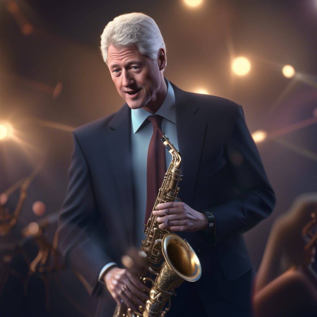 This image shows a young Bill Clinton playing the saxophone on MTV. The photorealistic digital painting captures the scene in stunning detail with a cinematic and atmospheric quality.
