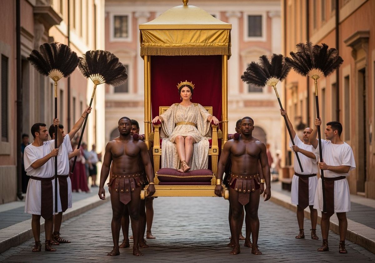 This image shows Empress Messalina on a litter throne carried by ten muscular bearers. Servants fan her as she is carried through an ancient Roman street, captured with natural lighting and sharp focus.