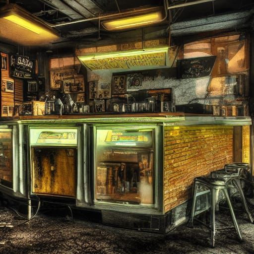 This matte painting depicts a derelict coffee shop filled with vintage electronics and antique record players. Moody, ethereal lighting and muted colors create a haunting atmosphere.
