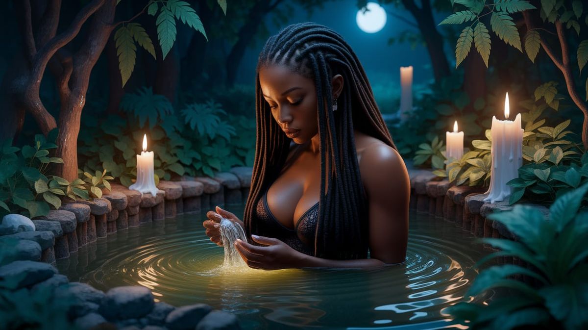 This image shows a majestic black woman with long dreadlocks bathing in a mystical forest pond under the soft glow of candlelight at night.