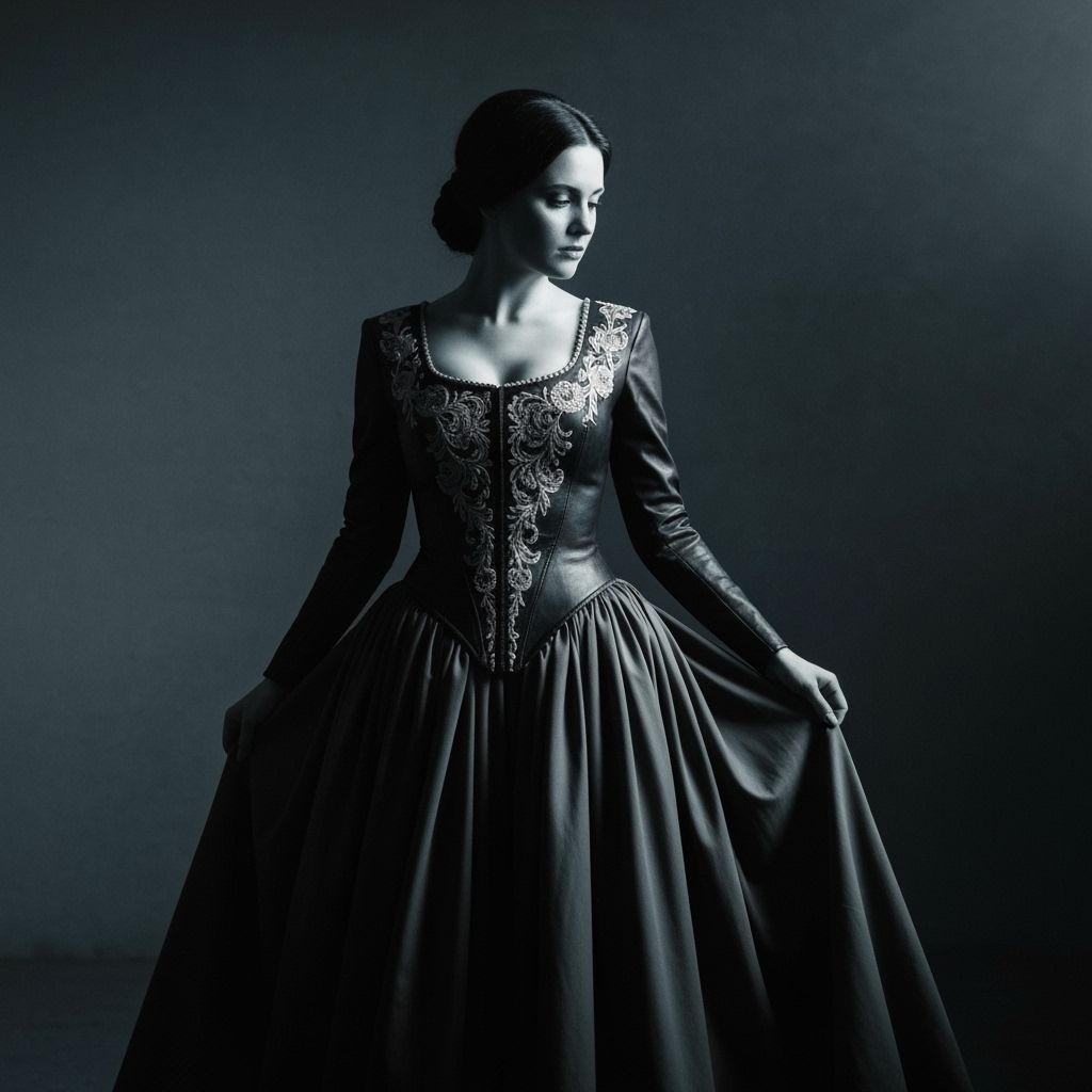 This hyperrealistic photograph captures a woman in a vintage, flowing gown with intricate embroidery. Dramatic lighting and a pensive expression create a cinematic, mysterious atmosphere.