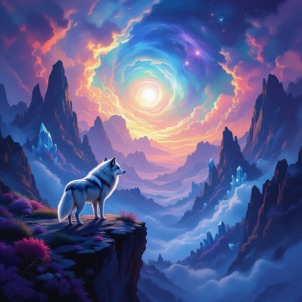 This image features a majestic wolf with moonlight-like fur on a cliff, gazing at a surreal alien world with glowing plants and crystals under a colorful nebula sky. It has a textured, mixed-media painting style.
