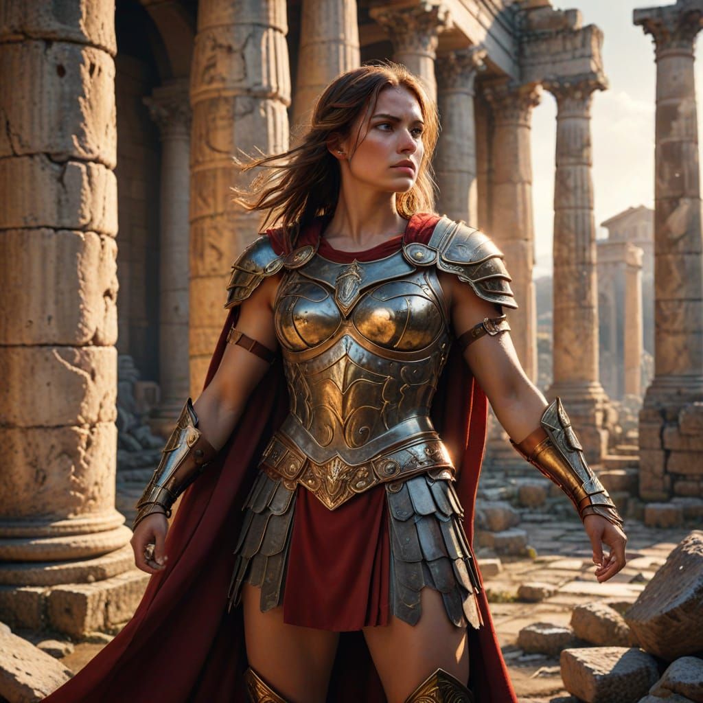 This image shows a powerful female gladiator standing in ancient Roman ruins, surrounded by stone columns and intricate armor design, with a gold breastplate and red cape, her strength and warrior spirit evident in her muscular physique and serious expression.