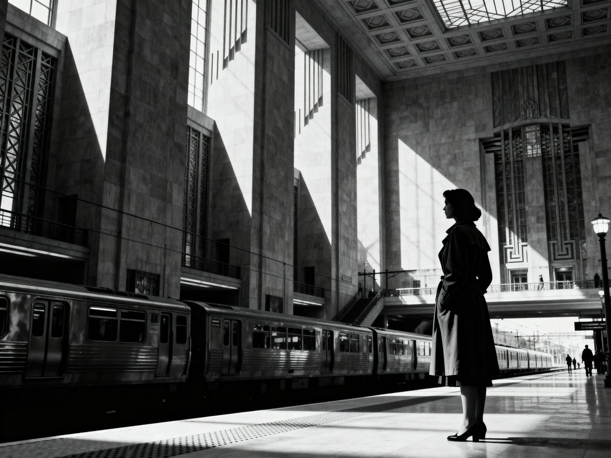 A lone woman waits on a shadowy, art deco platform in this high-contrast, monochrome image evoking film noir mystery and cinematic drama.