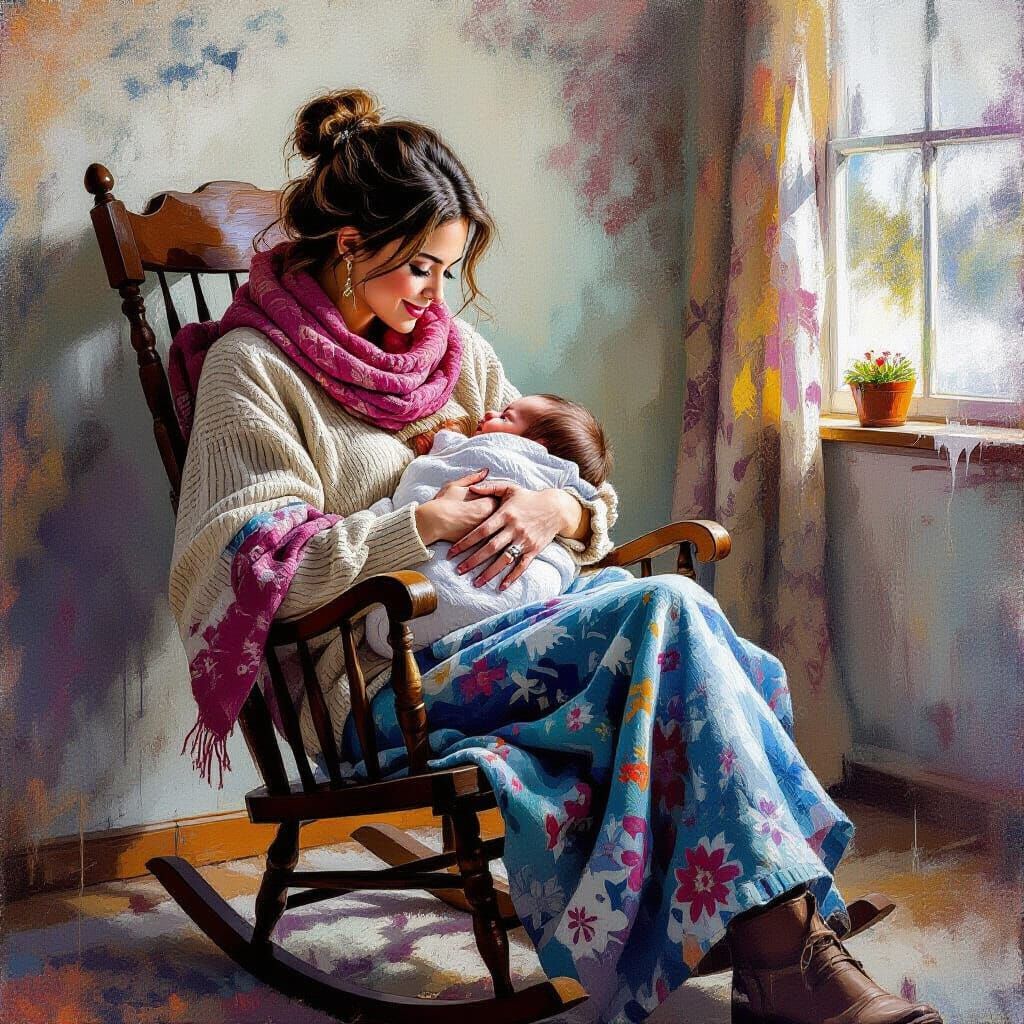 This image shows a mother in warm clothing gently rocking her swaddled infant in a vintage wooden rocking chair inside a cozy nursery. The image blends graffiti and splash art elements in polychromatic street art style.