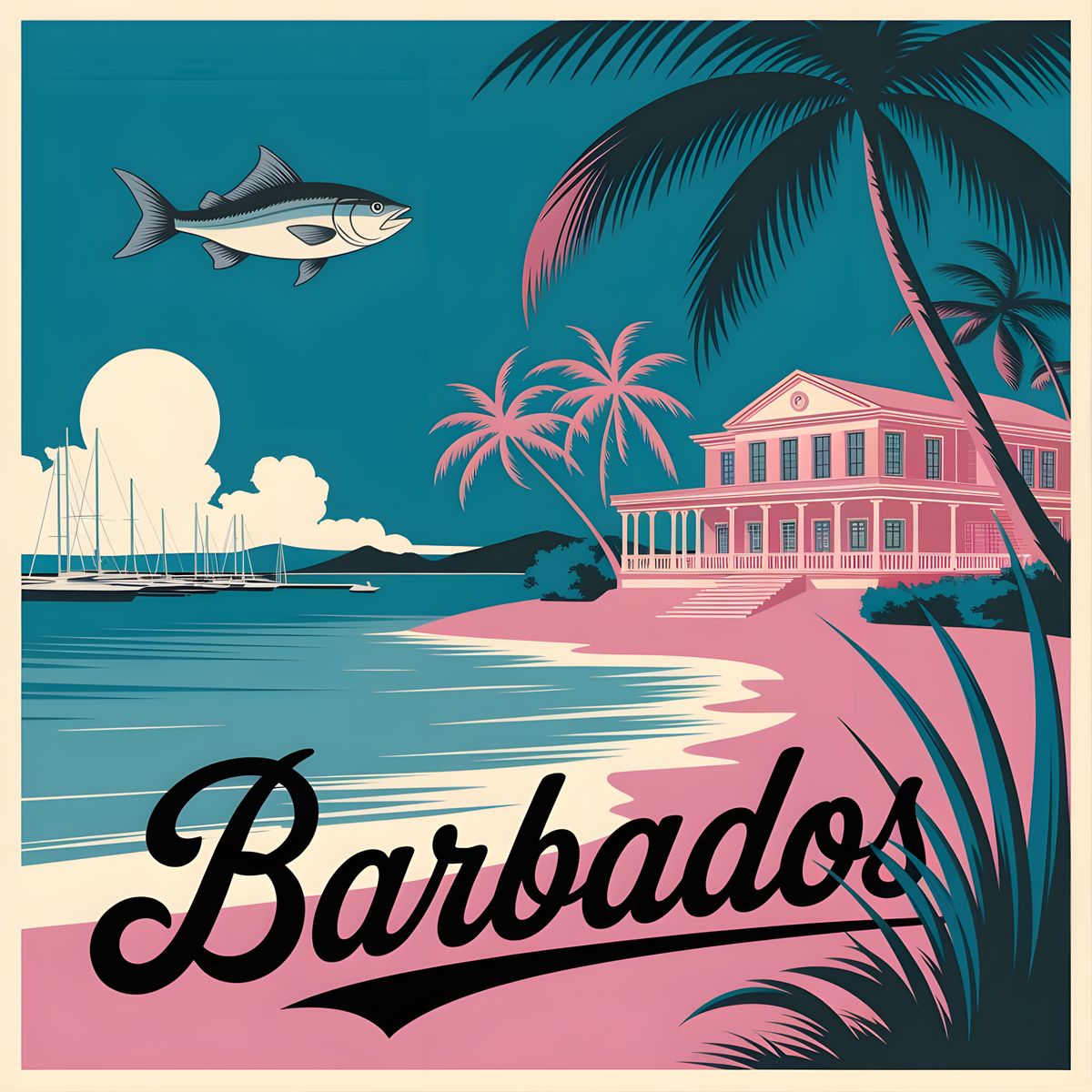 A vintage travel poster of Barbados. Pink sand beaches meet turquoise waters, with a plantation house and Bridgetown marina in the distance. A flying fish and sugar cane stalk are in the foreground.