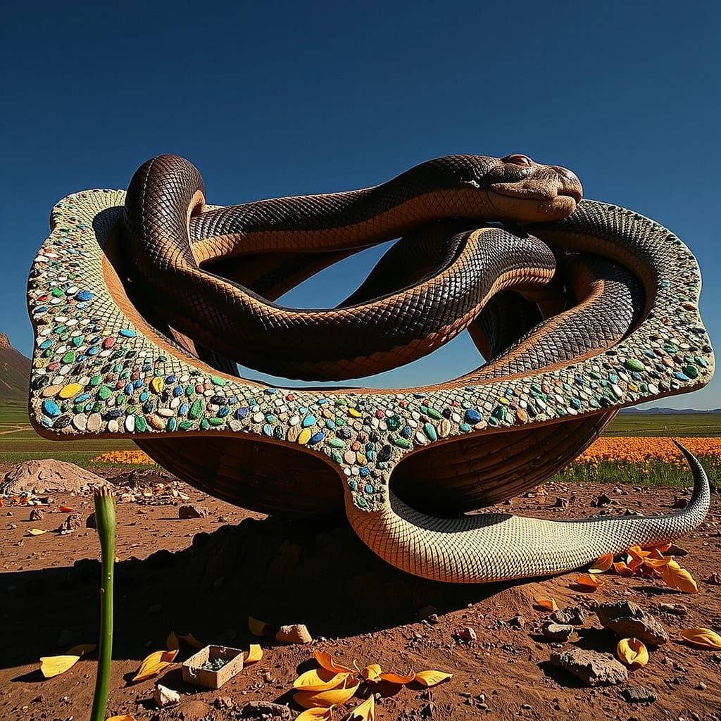 A striking image of a mythical chimera with lion, goat, and snake features, adorned with teal hair and a yellow flower, set against a vibrant night sky.