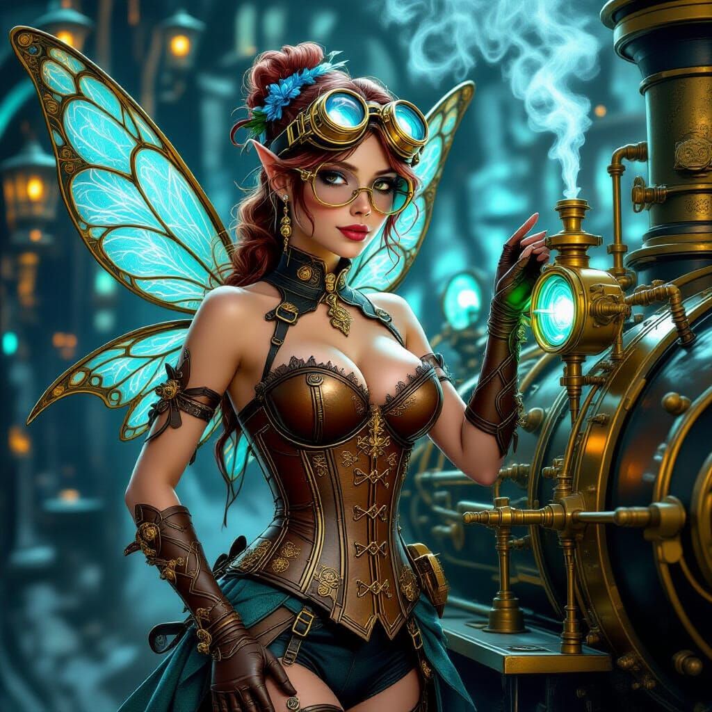 A steampunk fairy meticulously polishes her brass and glass locomotive amidst a backdrop of hissing pipes. The image blends industrial elements with whimsical fantasy in a steampunk aesthetic.