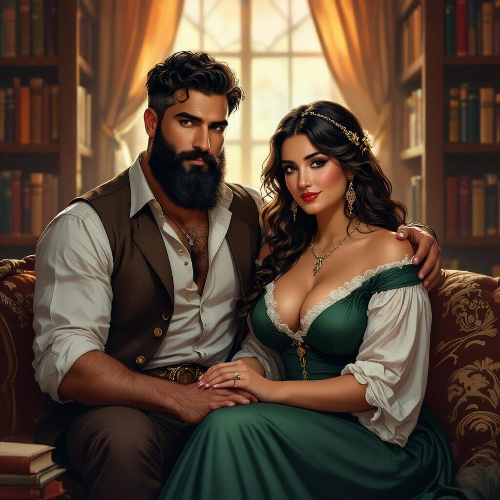 This image shows a well-built, bearded Arabic man and a curvy woman, both fully dressed, in a cozy home library. It is reminiscent of Alphonse Mucha and Gustav Klimt.