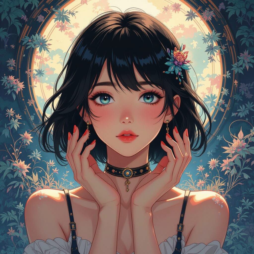 This image shows an anime-style portrait of a woman set against a surreal dreamlike background. The character is intricately designed with vivid chiaroscuro lighting and futuristic elements.