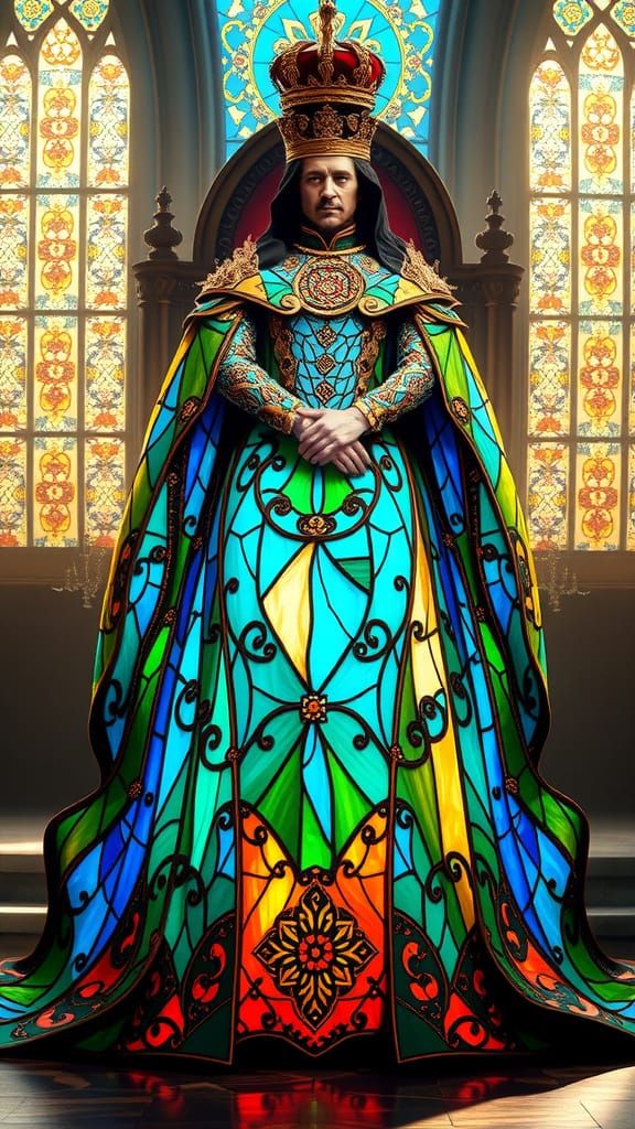 This image shows a regal king in an elaborate ballgown made of iridescent stained glass panels, reminiscent of cathedral windows. Fantasy art and haute couture style.