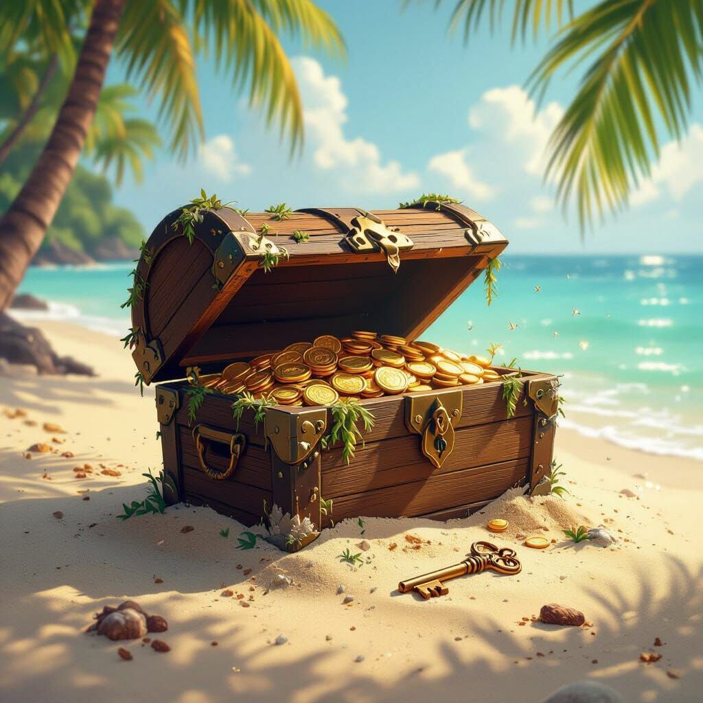 This image shows a timeworn treasure chest, half-buried in the sand of a tropical island. Glimmering gold and a fancy key are visible inside, presented with cinematic lighting and cel-shaded accents.