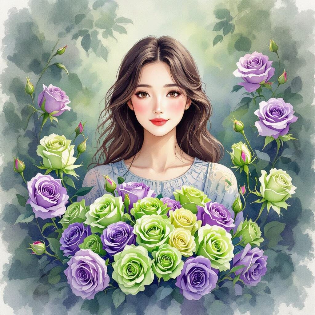 A serene picture of a woman surrounded by green and purple roses. The artwork is reminiscent of watercolor illustrations, with expressive brushstrokes and emotive depth.