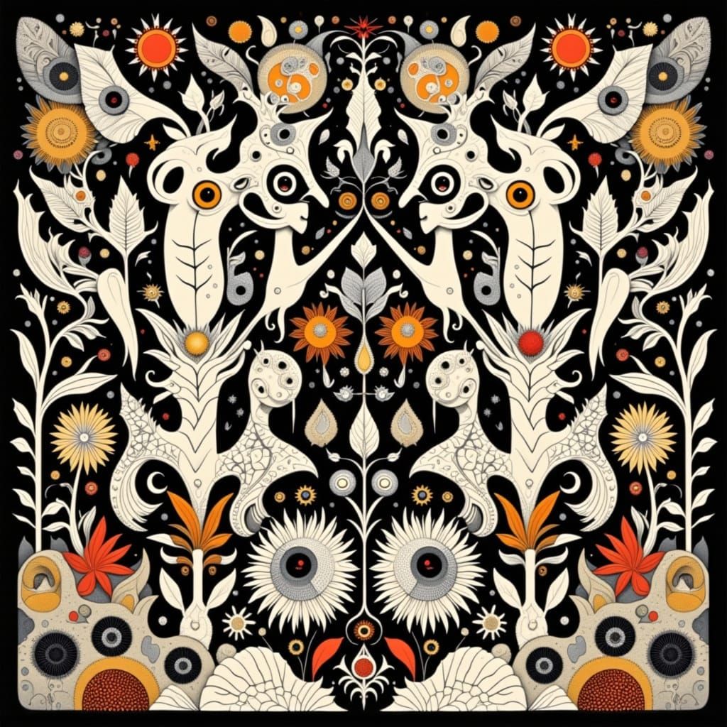 Ornate design with symmetrical totems of whimical creatures of fantasy.