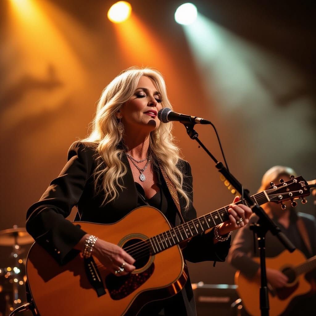 This image captures Emmylou Harris performing "Born to Run" under dynamic stage lighting. A wide-angle, cinematic view showcases high detail and realism with a gritty rock photography feel.