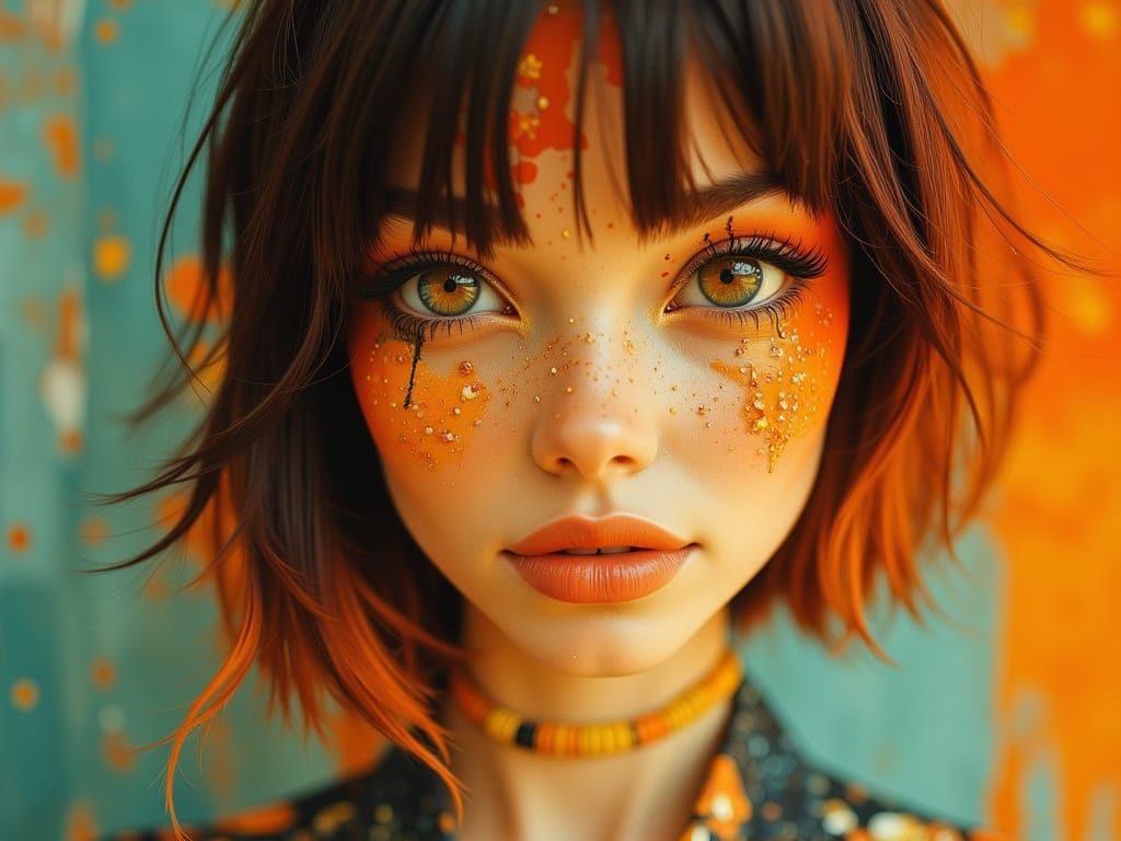 A stunning, detailed portrait of Dolores O'Riordan with glowing eyes and intricate textures. The image features a colorful, tie-dye aesthetic with a soft oil painting finish, set against a catacomb background.